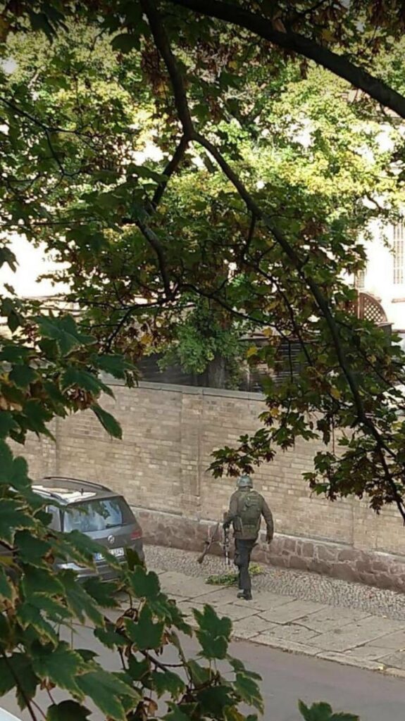 Une vidéo diffusée par une chaîne de télévision allemande après la fusillade de Halle montre un homme en tenue militaire ouvrir le feu en pleine rue à proximité d’une voiture.