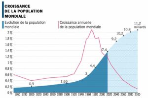 Mais, après un pic de 2,05 % par an dans les années 1965-1970, la croissance de la population mondiale a commencé à ralentir pour atteindre 1,1 % aujourd’hui.
