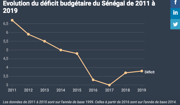 Lors de son adresse à la nation, le 31 décembre 2019, le président sénégalais Macky Sall a fait état d’une « réduction constante du déficit budgétaire ». Il donne comme preuve le fait que ce déficit était à 6,7 % en 2011 et se situe à 3,7 % en 2019.